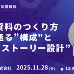 2025年11月9日 / 最終更新日時 : 2025年11月9日 AllBridge Event 【新規事業担当者 向け】ピッチ資料のつくり方|社内で通る”構成”と伝わる”ストーリー設計” 「ピッチ資料」と言われて思い浮かぶのは、スタートアップの投資家向けピッチ。しかし、社内新規事業のピッチはまったく異なる“構造”を持っています。 事業の面白さよりも、 「社内で実行できるのか?」「経営戦略にどう貢 […]
