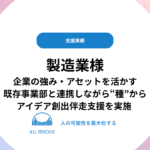 2025年9月1日 / 最終更新日時 : 2025年10月1日 AllBridge News 製造業様 新規事業アイデア創出支援実績 – 企業の強み・アセットを活かし、既存事業部と連携しながら“種”から伴走 – ■ プロジェクト概要 All Bridge株式会社は、製造業企業様に対し、新規事業の“種”から共に考え、創り上げていく支援を実施しました。このプロジェクトでは、企業が持つ技術やアセットを活かしながら、新たな市場で価値提供 […]