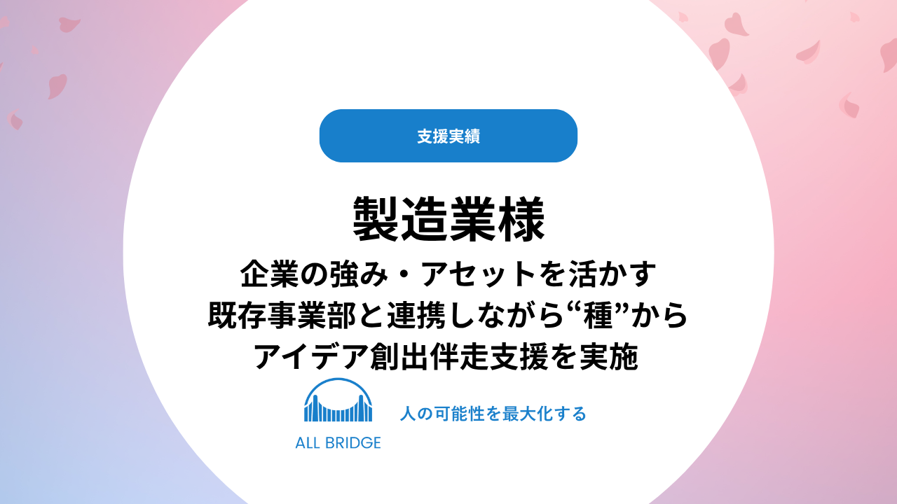■ プロジェクト概要 All Bridge株式会社は、製造業企業様に対し、新規事業の“種”から共に考え、創り上げていく支援を実施しました。このプロジェクトでは、企業が持つ技術やアセットを活かしながら、新たな市場で価値提供 […]