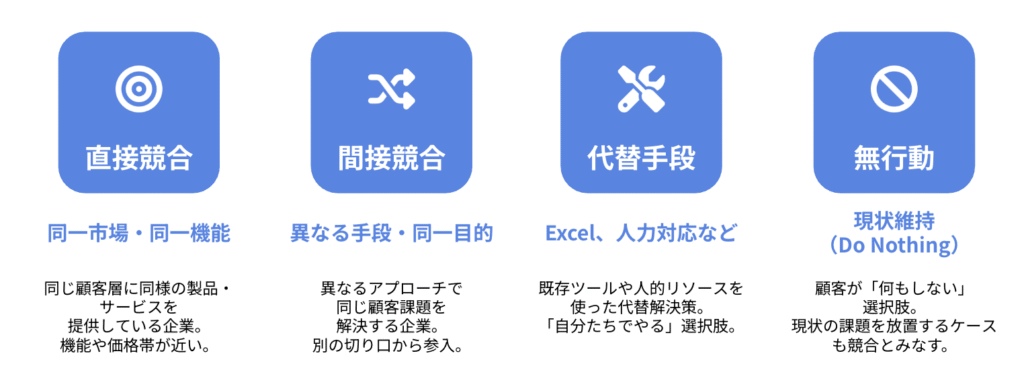 特に、新規事業においては現状維持が最大の競合となるケースが多いため、直接競合だけを見て視野狭窄に陥らないことが重要です。