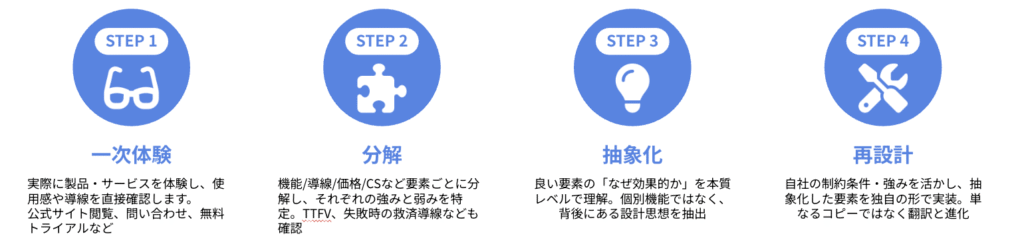 競合他社の情報収集にあたっては、デスクトップリサーチ(公的情報、メディア、ユーザーの声/SNSなど)も重要ですが、実際に商品・サービスを実利用してみること や、顧客に直接会いに行く顧客ヒアリング、展示会への参加などを通じて、現場から学ぶ姿勢が求められます。