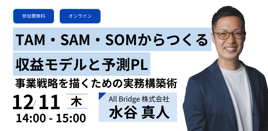 本セミナーでは、多くの大手企業で伴走支援を行ってきたAll Bridge株式会社の実務知から、「市場規模 → 収益モデル → 予測PL → 戦略」までを一貫させる方法を体系的に解説します。