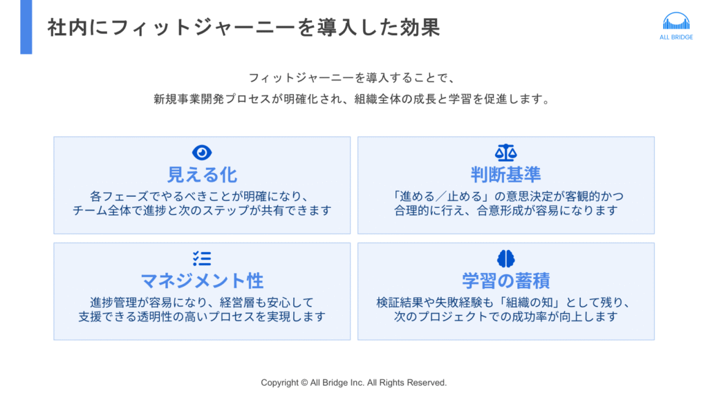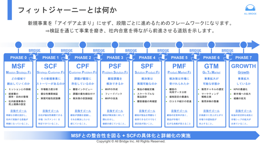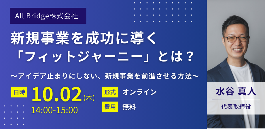All Bridge株式会社は、2025年10月2日に「新規事業を成功に導く『フィットジャーニー』とは? ~アイデア止まりにしない、新規事業を前進させる方法~」と題したオンラインセミナーを開催しました。本レポートでは、代表取締役 水谷真人による講演をもとに、新規事業を体系的に進めるためのフレームワーク「フィットジャーニー」の全体像と活用方法をご紹介します。