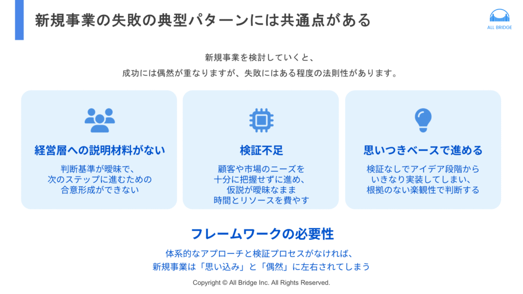 新規事業の現場では、以下のような課題が頻繁に見られます。