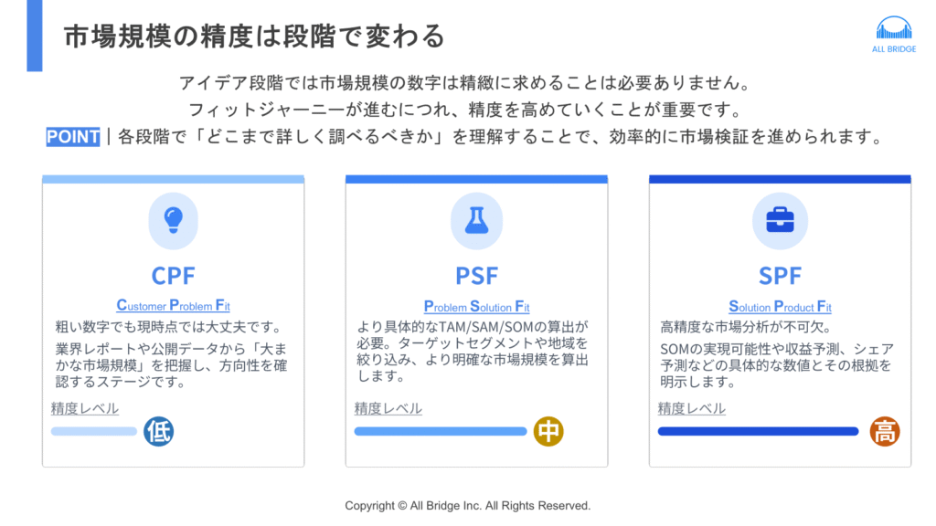 また、初期のアイデア段階では荒い数値でも許容されますが、検証が進むフェーズ(CPF: Customer-Product Fit以降)においては、徐々に数値を洗練させていく視点が不可欠です。