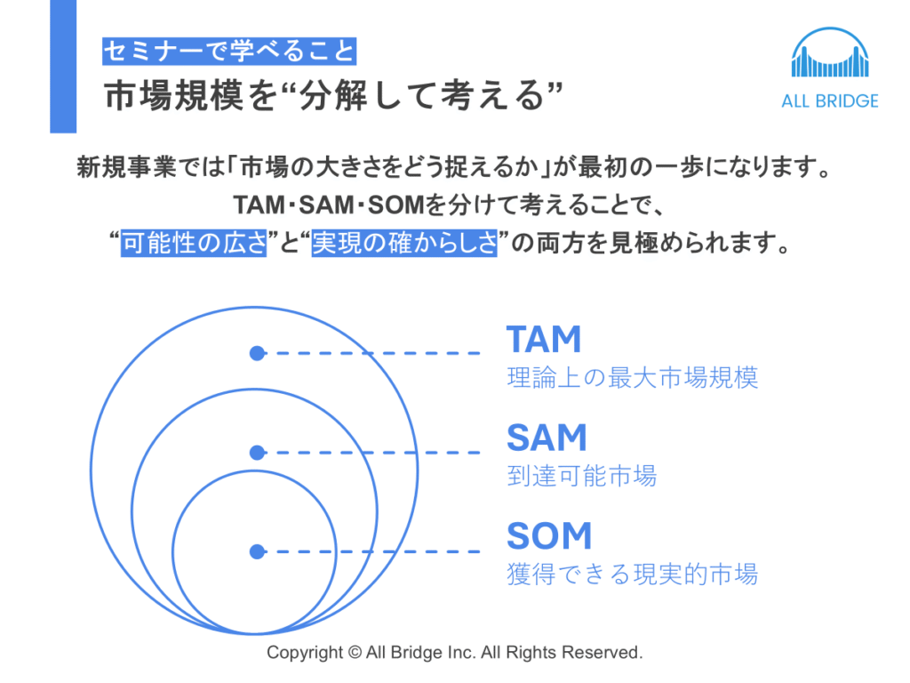 新規事業のポテンシャルを示すために、TAM(獲得可能な最大市場規模)、SAM(サービス提供可能な市場規模)、SOM(短期的に獲得可能な市場規模)を明確にすることが求められます。